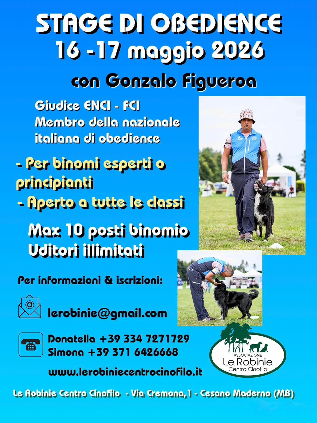 Le Robinie Centro Cinofilo Via Cremona 1, Cesano Maderno (MB), ItaliaStage di Obedience 16-17 Maggio 2026 con Gonzalo Figueroa Giudice ENCI - FCI membro della nazionale italiana di obedience. Iscrizioni aperte ad un massimo di 10 binomi Compilare il form "Modulo di iscrizione" allegando: Modulo privacy Modulo liberatoria Copia del bonifico Per il bonifico: Intestatario: Associazione LE ROBINIE Centro Cinofilo IBAN: IT15X0844032910000000261646 Dove dormire (link)